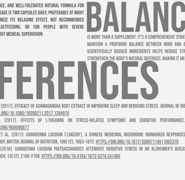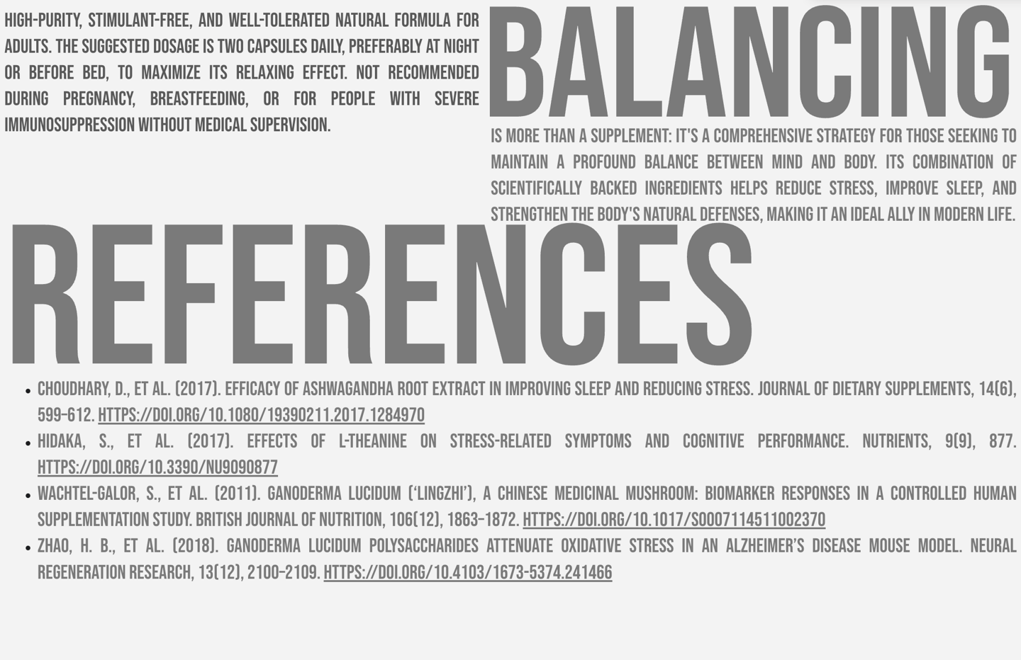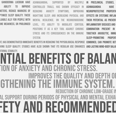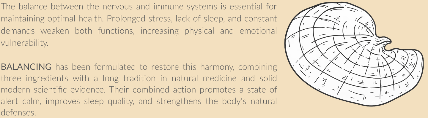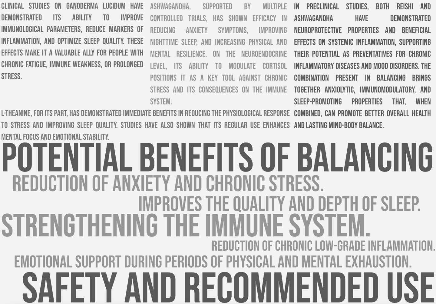 BALANCING is an advanced formula that combines Ganoderma lucidum (Reishi), Ashwagandha (Withania somnifera), and L-Theanine to balance the nervous system, modulate the immune response, and promote a state of deep calm without sedation. Designed for people facing chronic stress, emotional fatigue, or weakened immunity, this supplement acts on the neuroendocrine and immune axes to promote restful sleep, emotional stability, and resilience to external agents.