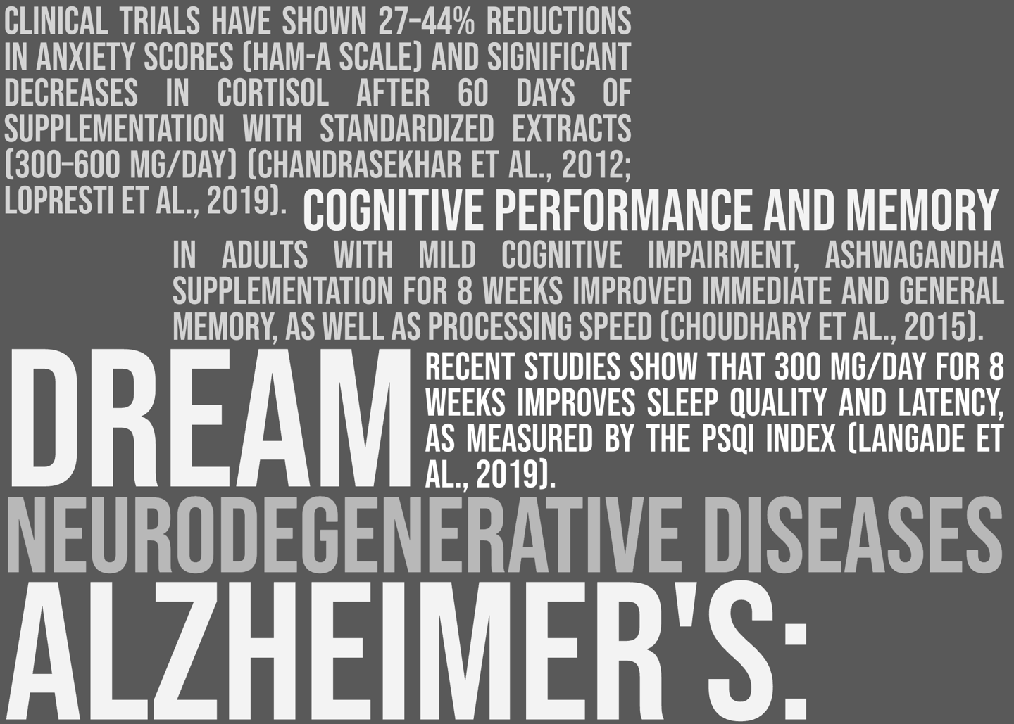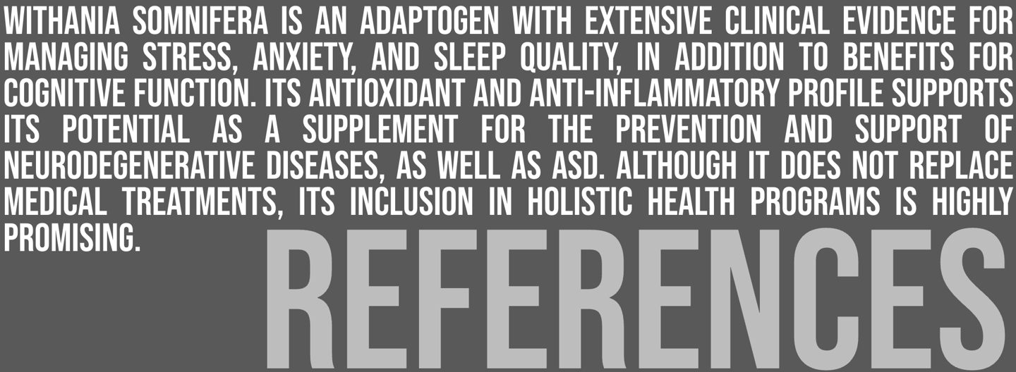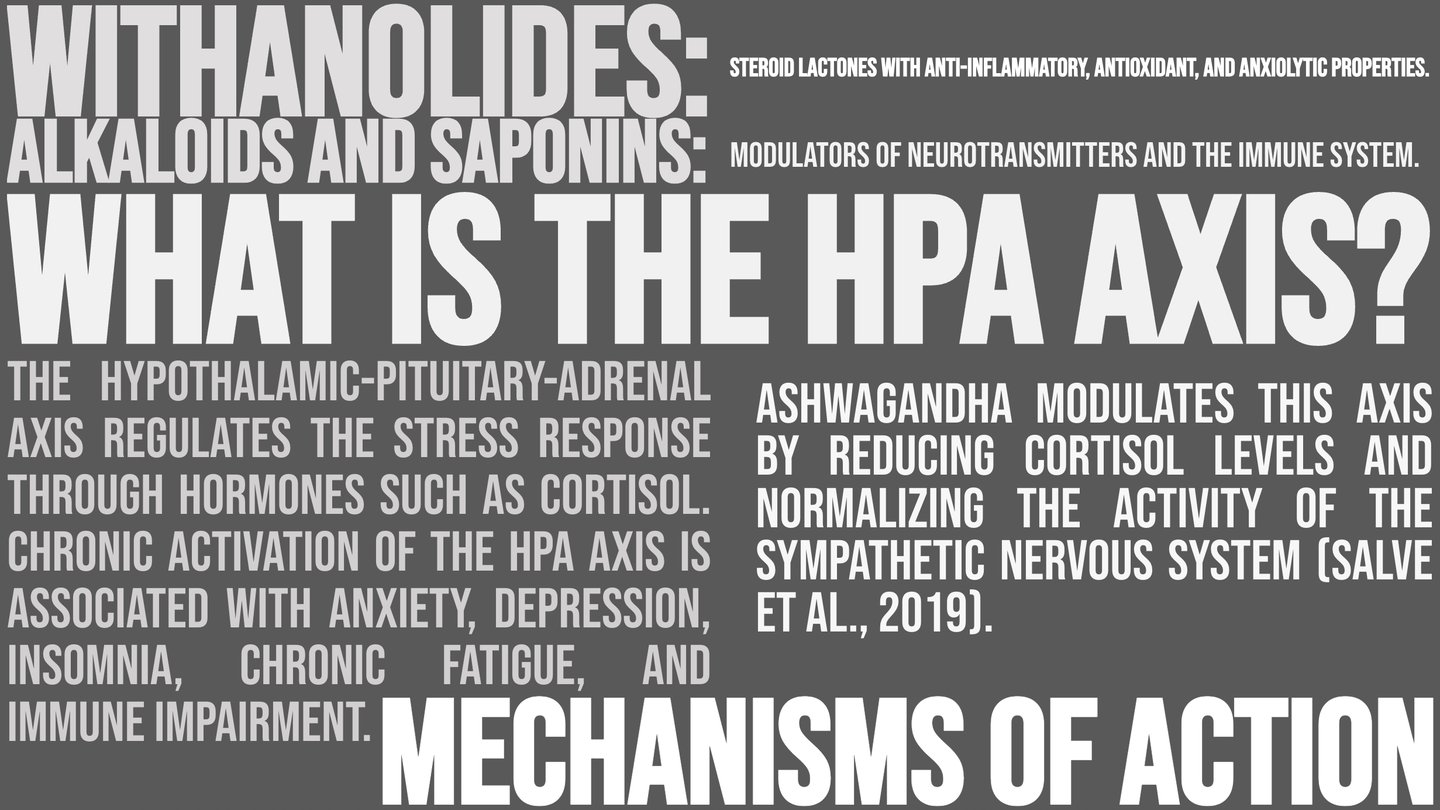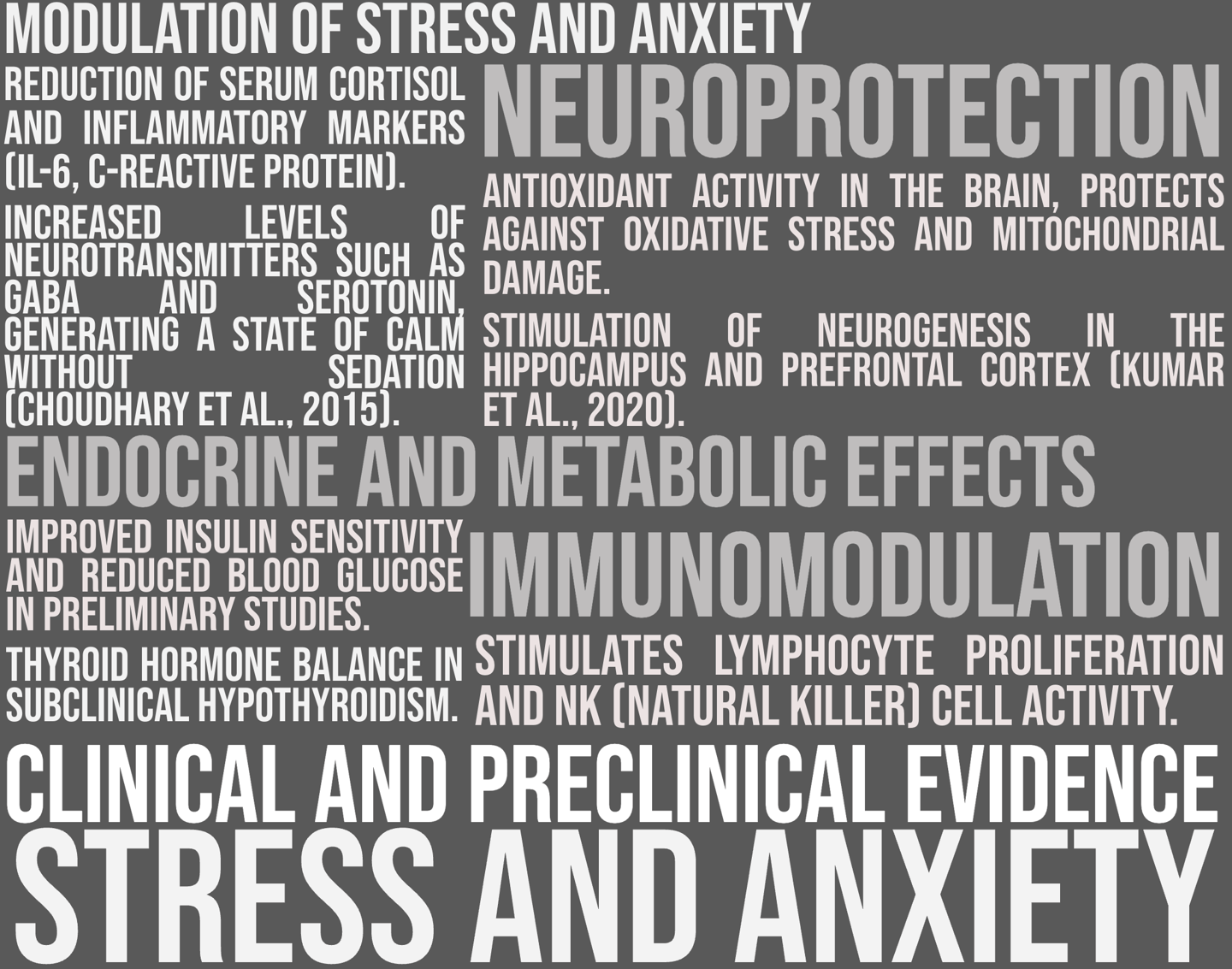 Mechanism of action: It acts as an adaptogen, regulating the hypothalamic-pituitary-adrenal axis, reducing cortisol and the inflammatory response. It contains withanolides with anxiolytic, anti-inflammatory, and neuroprotective properties.