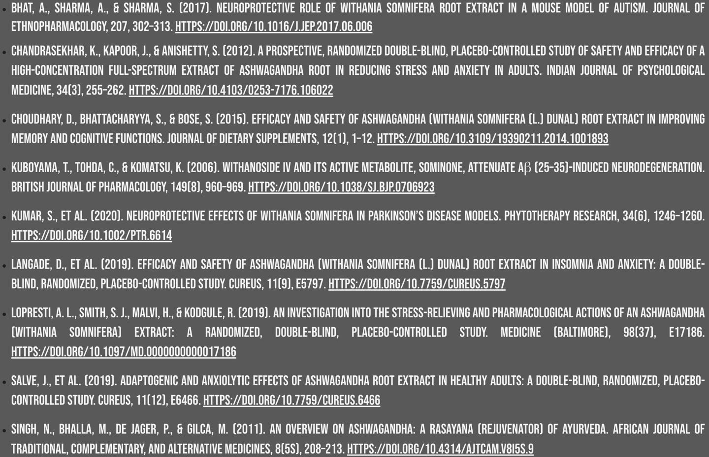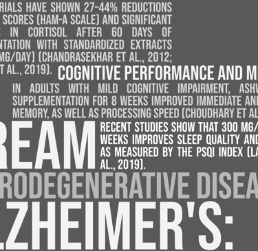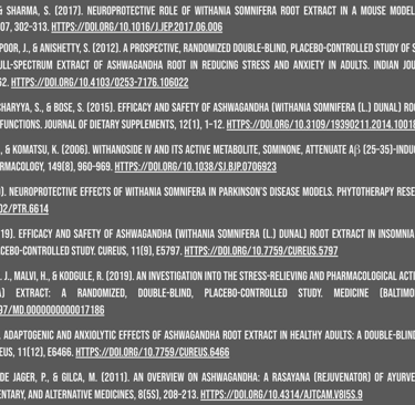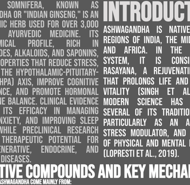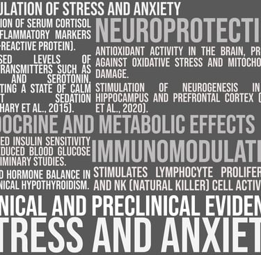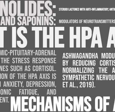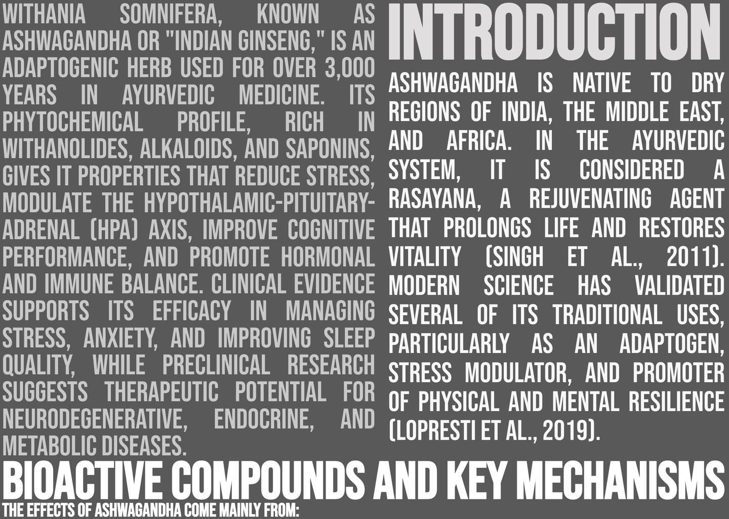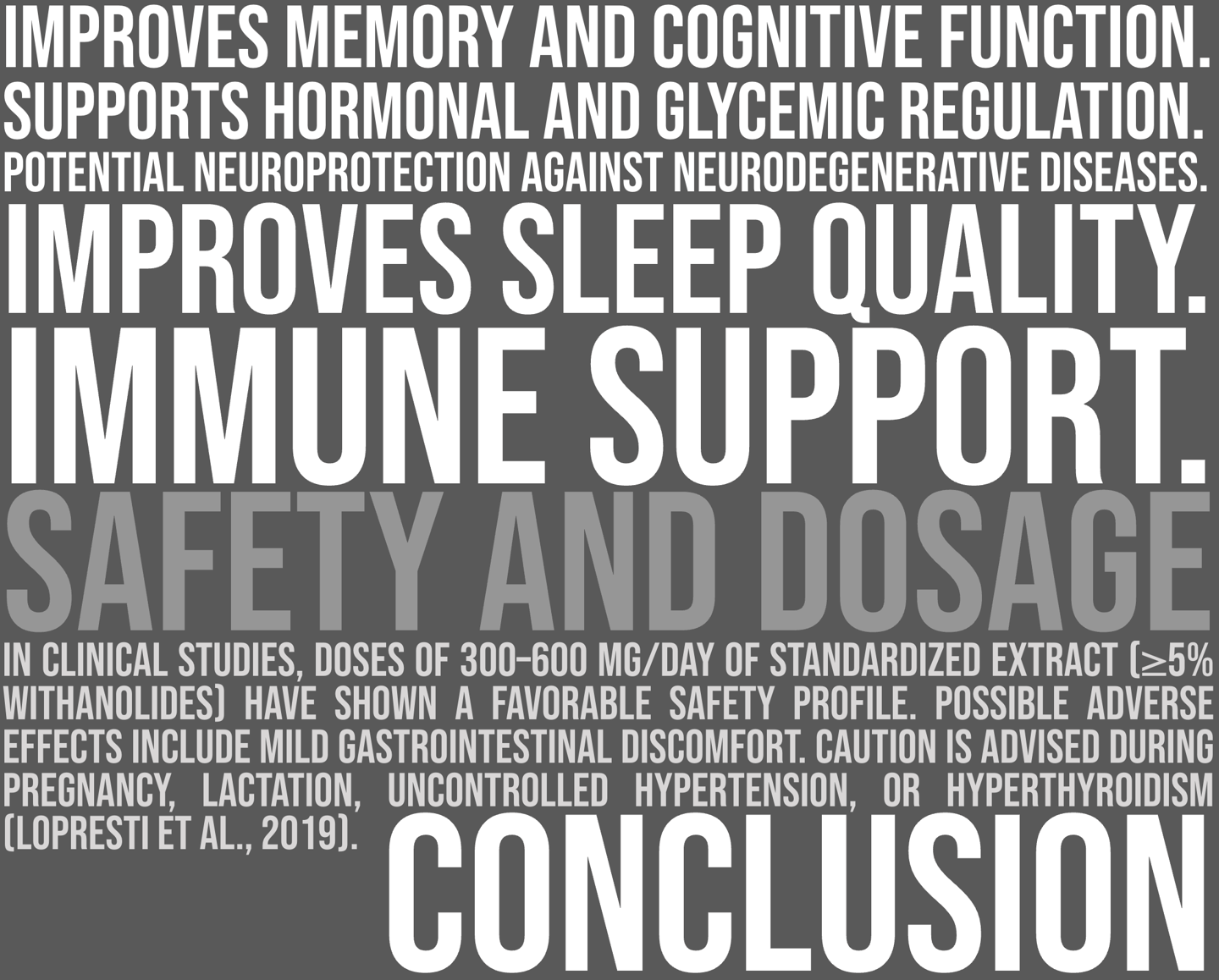 Mechanism of action: It acts as an adaptogen, regulating the hypothalamic-pituitary-adrenal axis, reducing cortisol and the inflammatory response. It contains withanolides with anxiolytic, anti-inflammatory, and neuroprotective properties.