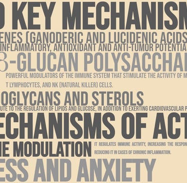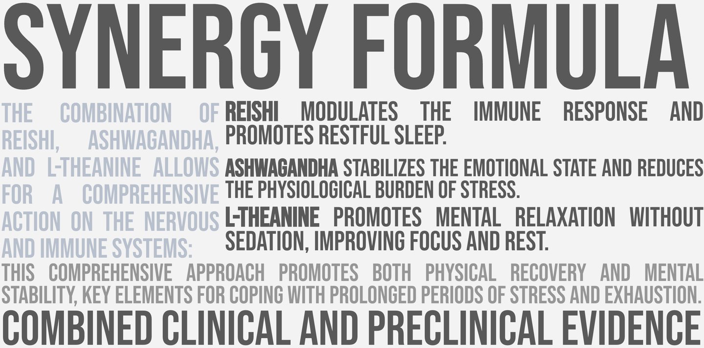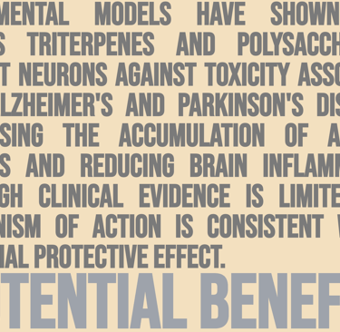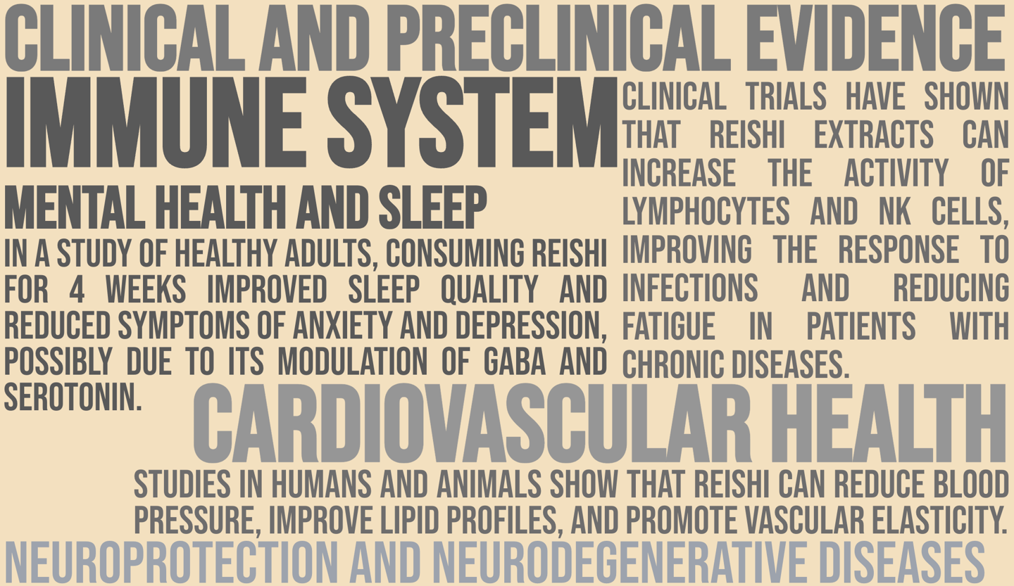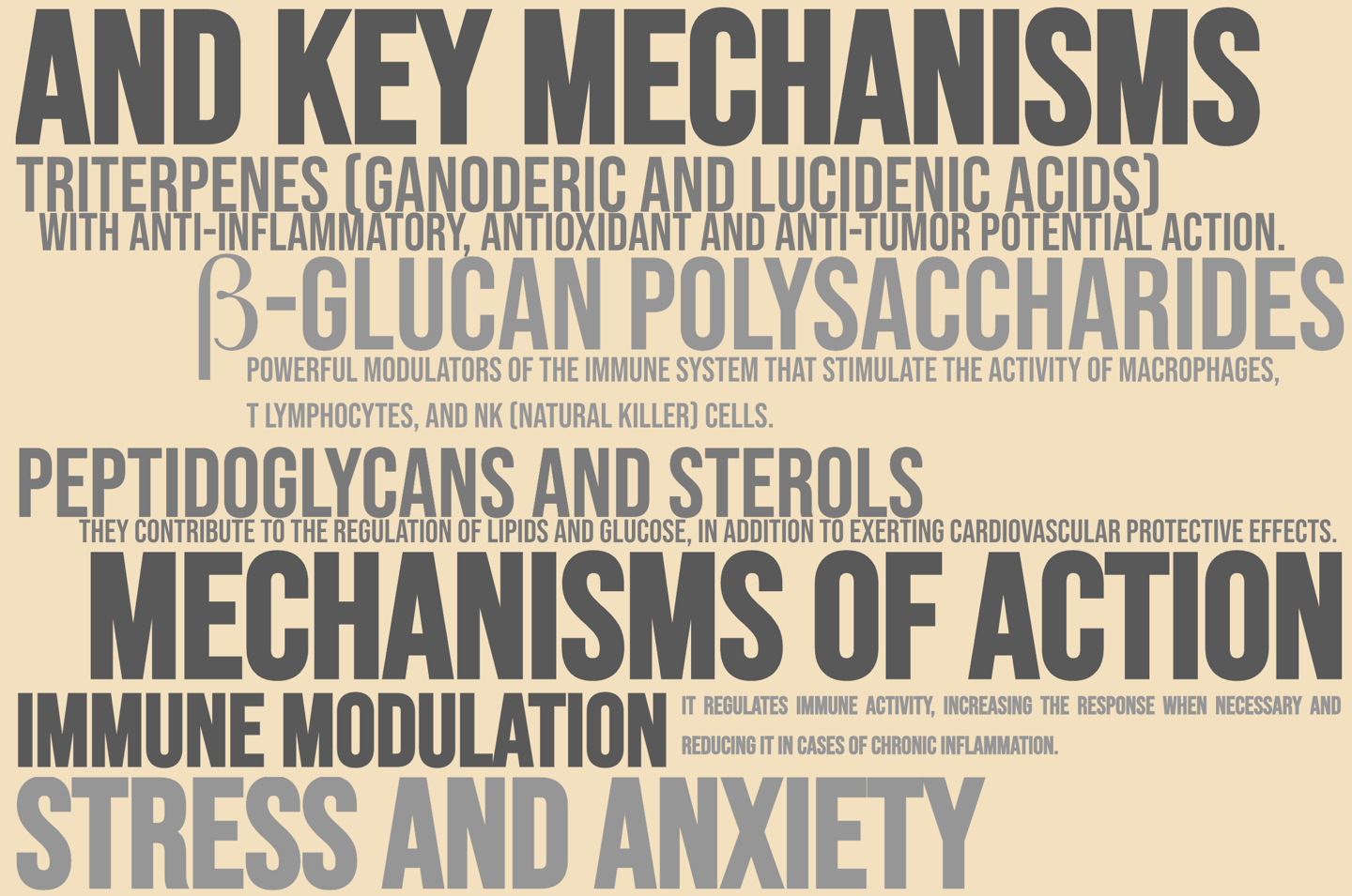 Mechanism of action: Contains triterpenes and polysaccharides with immunomodulatory, anti-inflammatory, and adaptogenic properties. It regulates immune system activity, reducing hyperactivity in cases of chronic inflammation and enhancing the defensive response to infections. It also modulates neurotransmitters and promotes sound sleep.