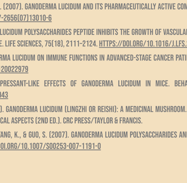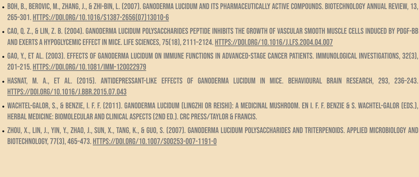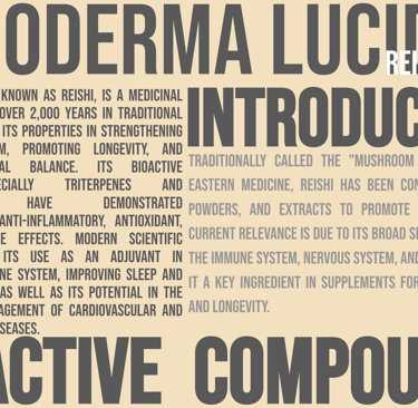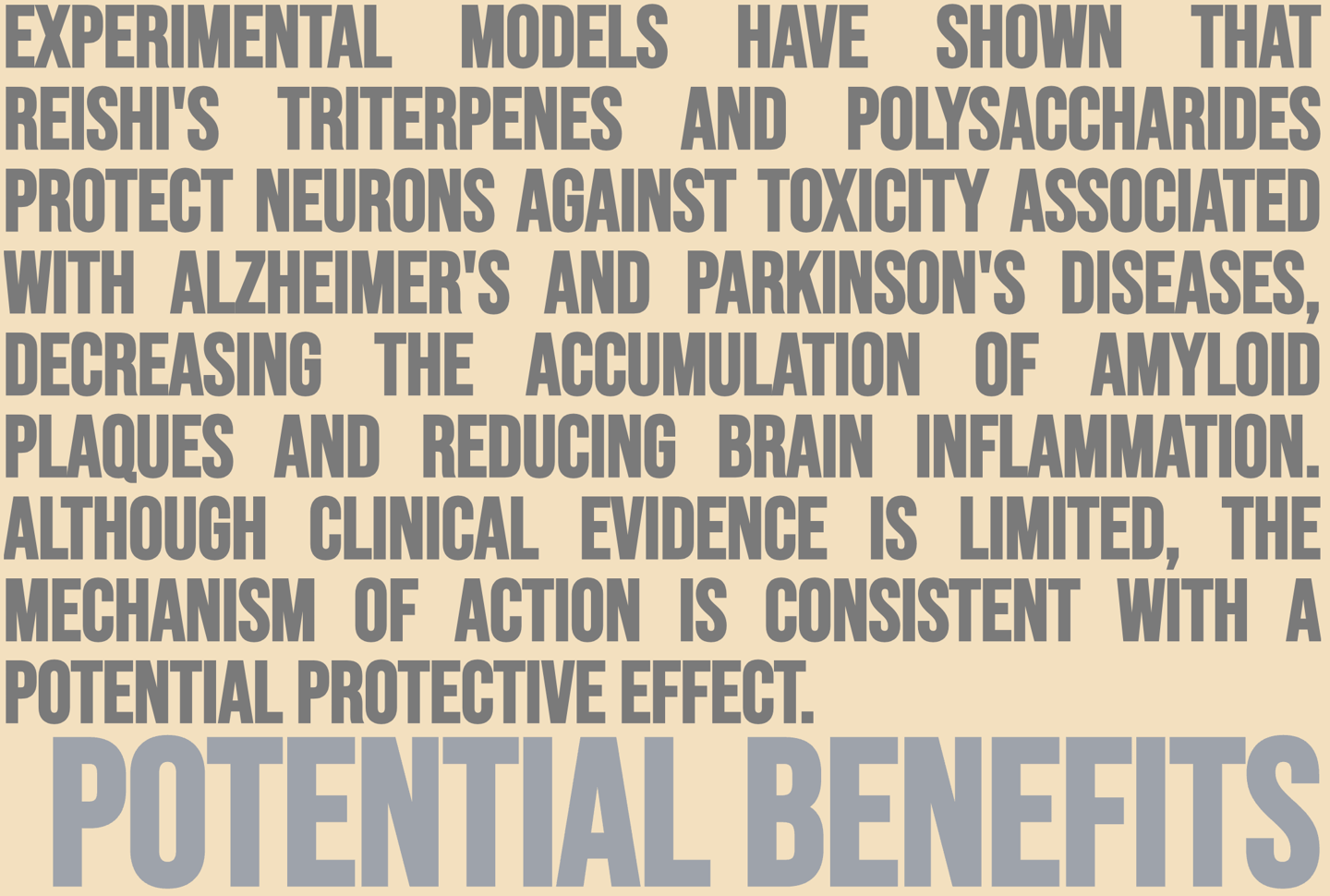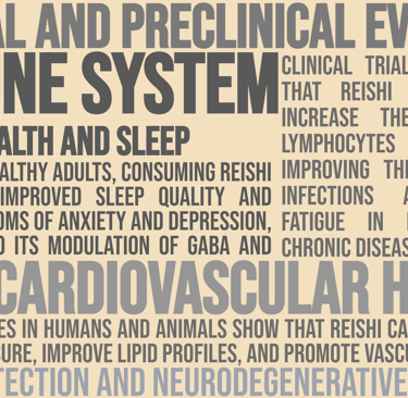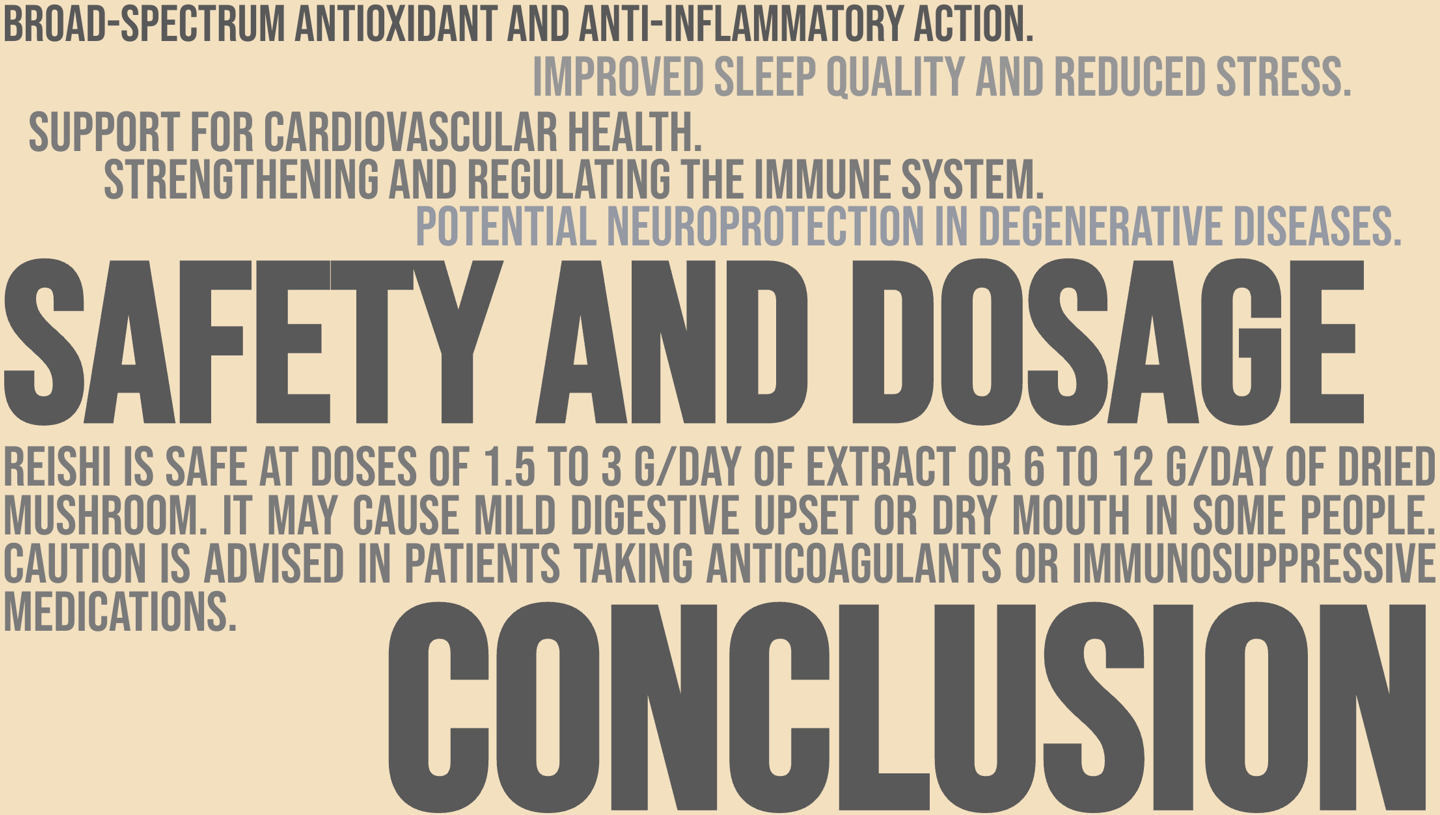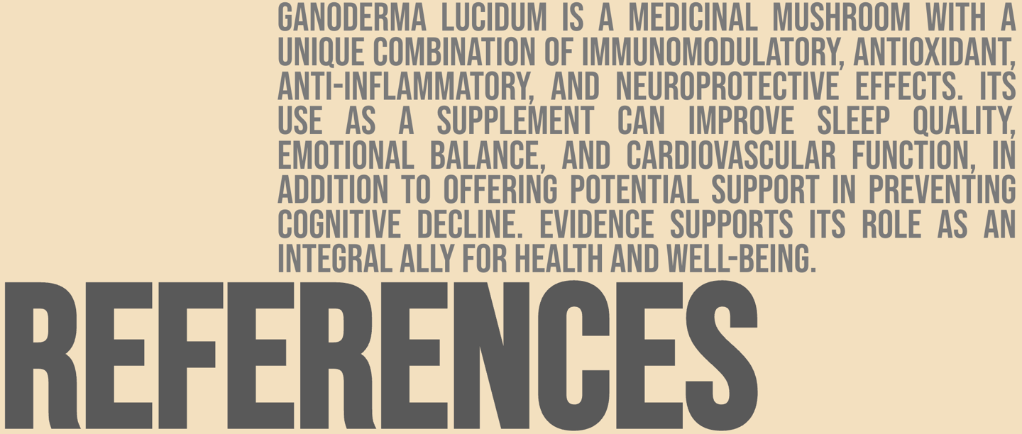 Mechanism of action: Contains triterpenes and polysaccharides with immunomodulatory, anti-inflammatory, and adaptogenic properties. It regulates immune system activity, reducing hyperactivity in cases of chronic inflammation and enhancing the defensive response to infections. It also modulates neurotransmitters and promotes sound sleep.