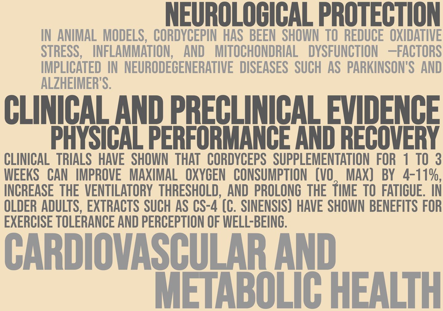 Clinical evidence: Trials in athletes and older adults have shown improvements in VOâ‚‚ max, endurance, and post-exercise recovery. A positive effect on glucose regulation and immune function has also been observed.