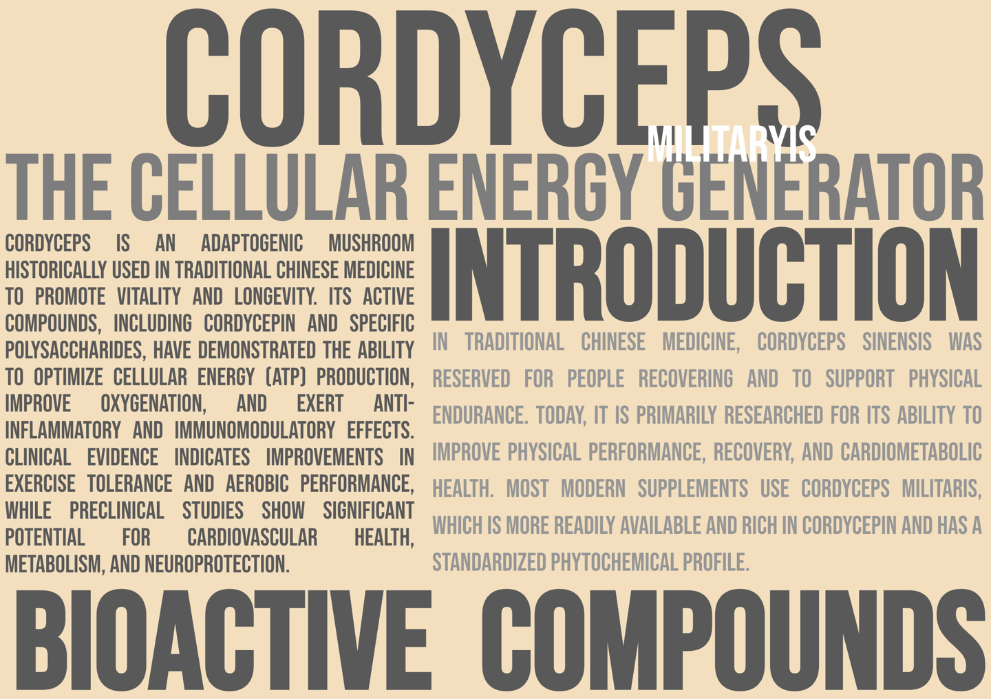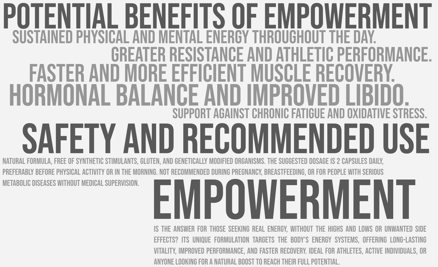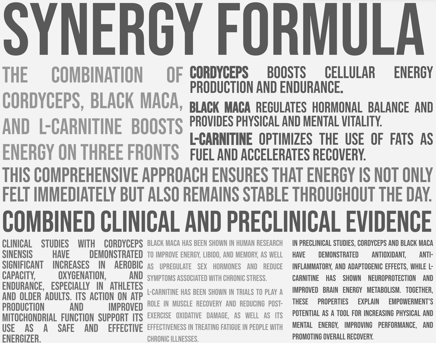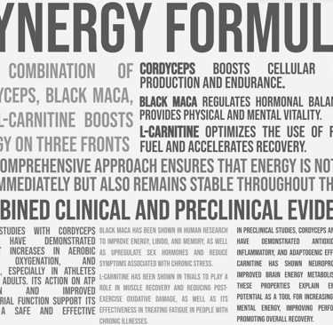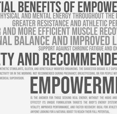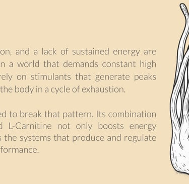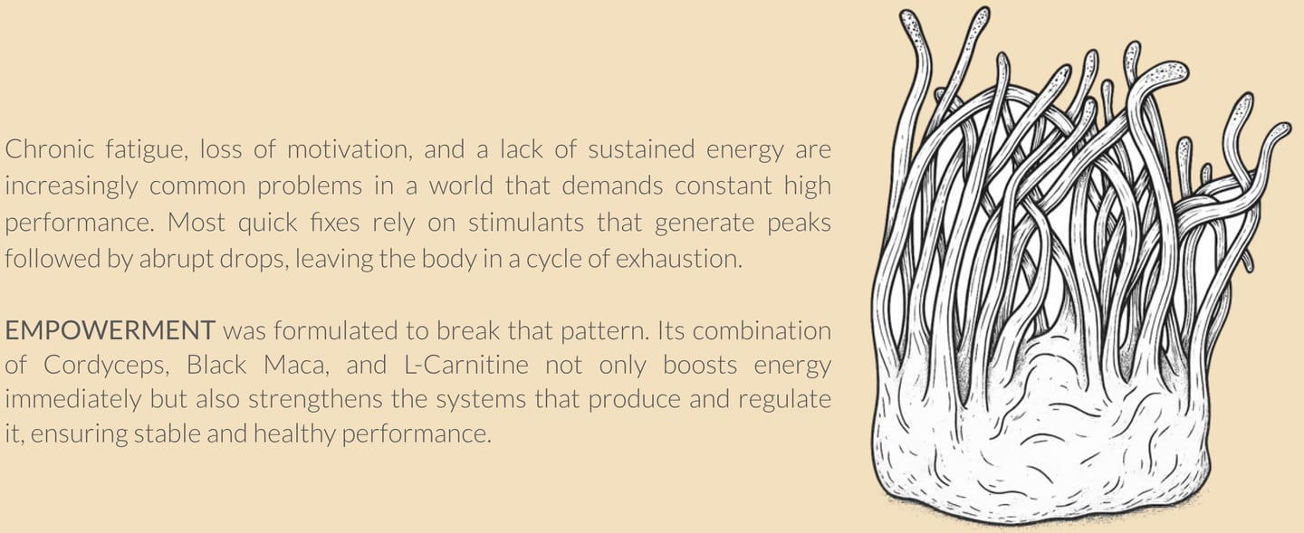 EMPOWERMENT is an advanced formula that combines Cordyceps militaris, Black Maca (Lepidium meyenii), and L-Carnitine to optimize cellular energy production, improve physical and mental performance, and promote faster recovery. Designed for those seeking a natural source of vitality without the highs and lows of synthetic stimulants, this supplement acts at the mitochondrial, hormonal, and metabolic levels to sustain performance throughout the day.