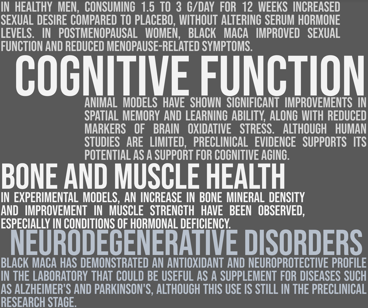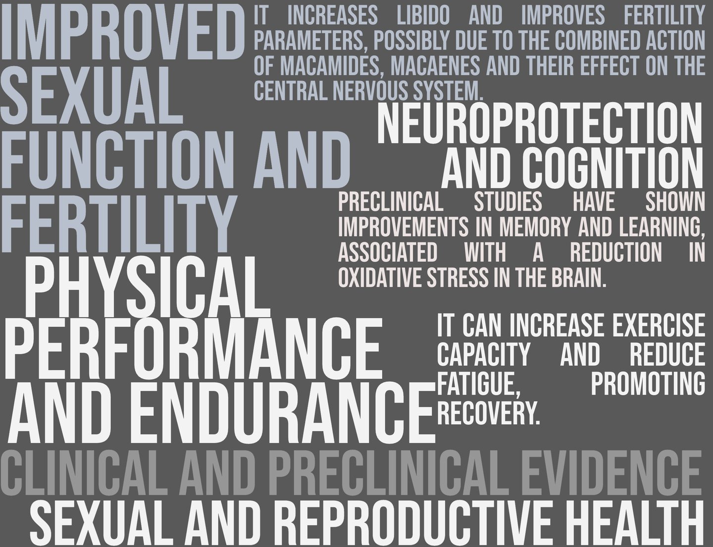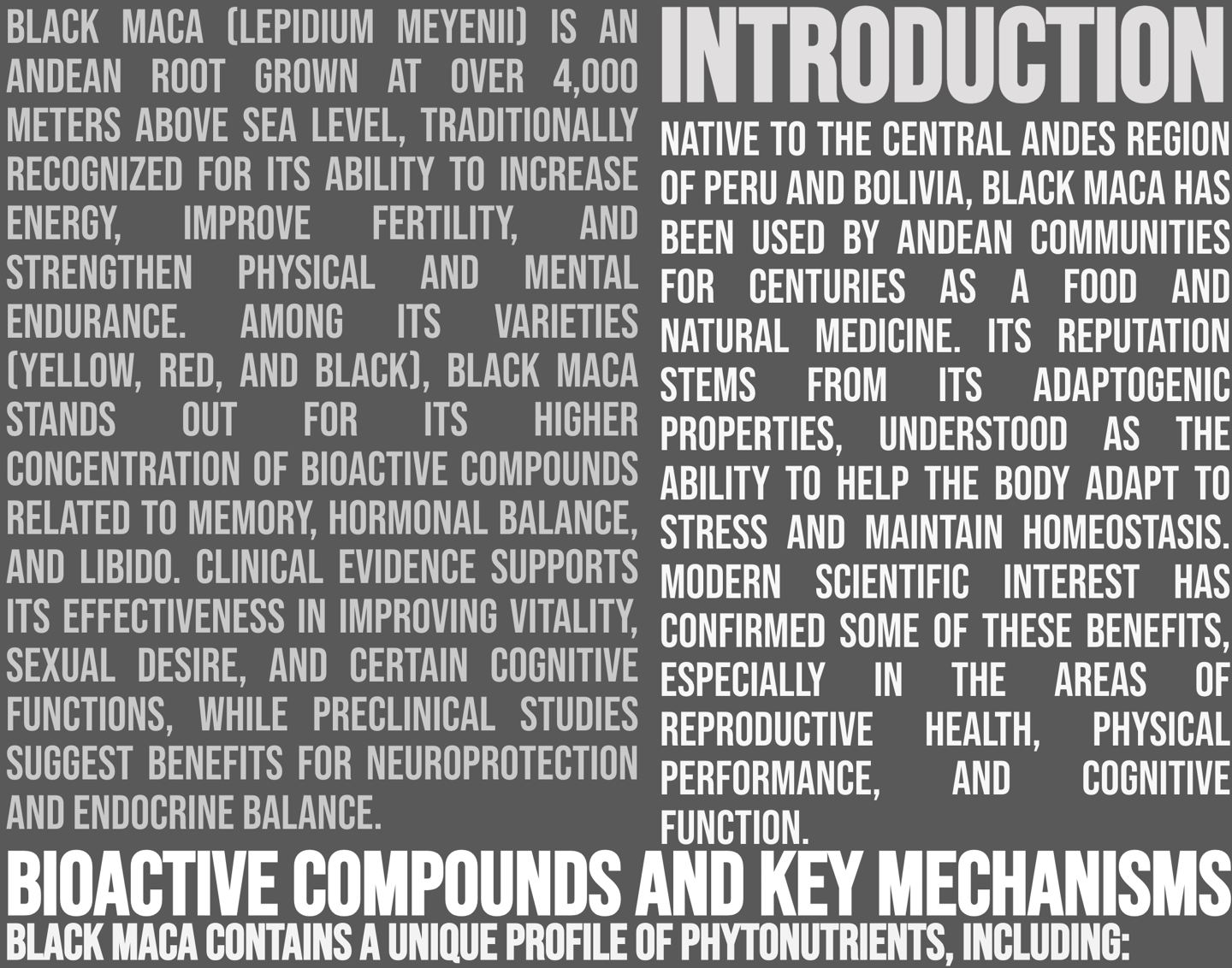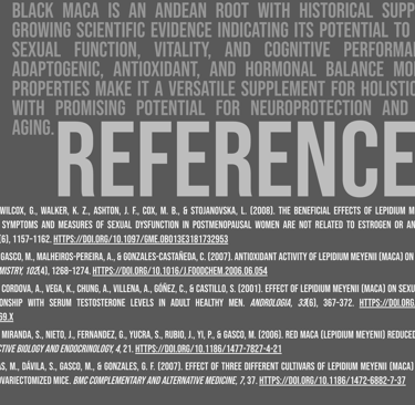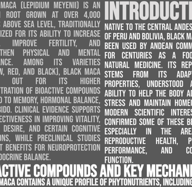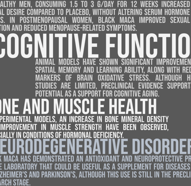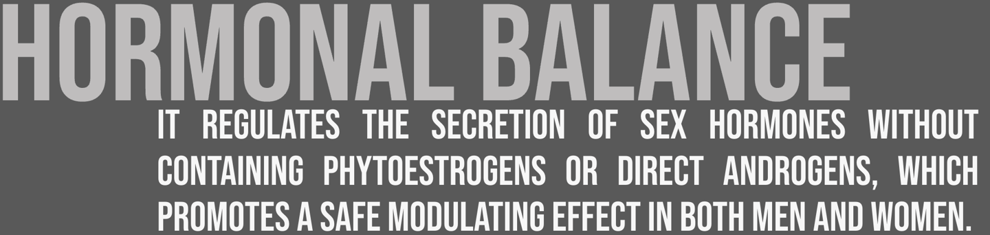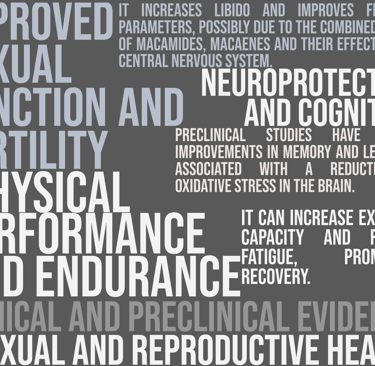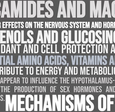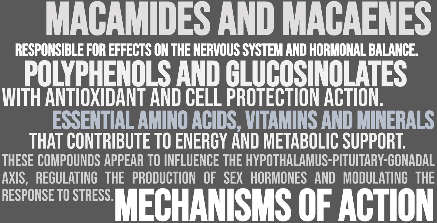 Mechanism of action: Rich in macamides and macamines, bioactive compounds that regulate the hypothalamic-pituitary-gonadal axis, optimizing hormonal balance and improving physical energy, libido, and mental clarity. It also contains antioxidants that protect against cellular damage.