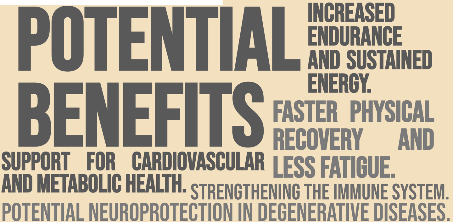 Conditions it can help with: chronic fatigue, poor physical performance, slow recovery after exercise, immune weakness, oxidative stress.