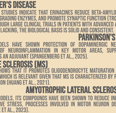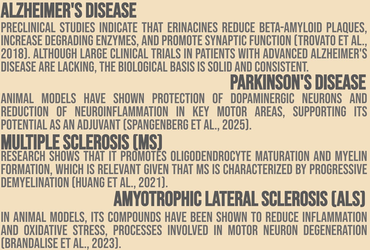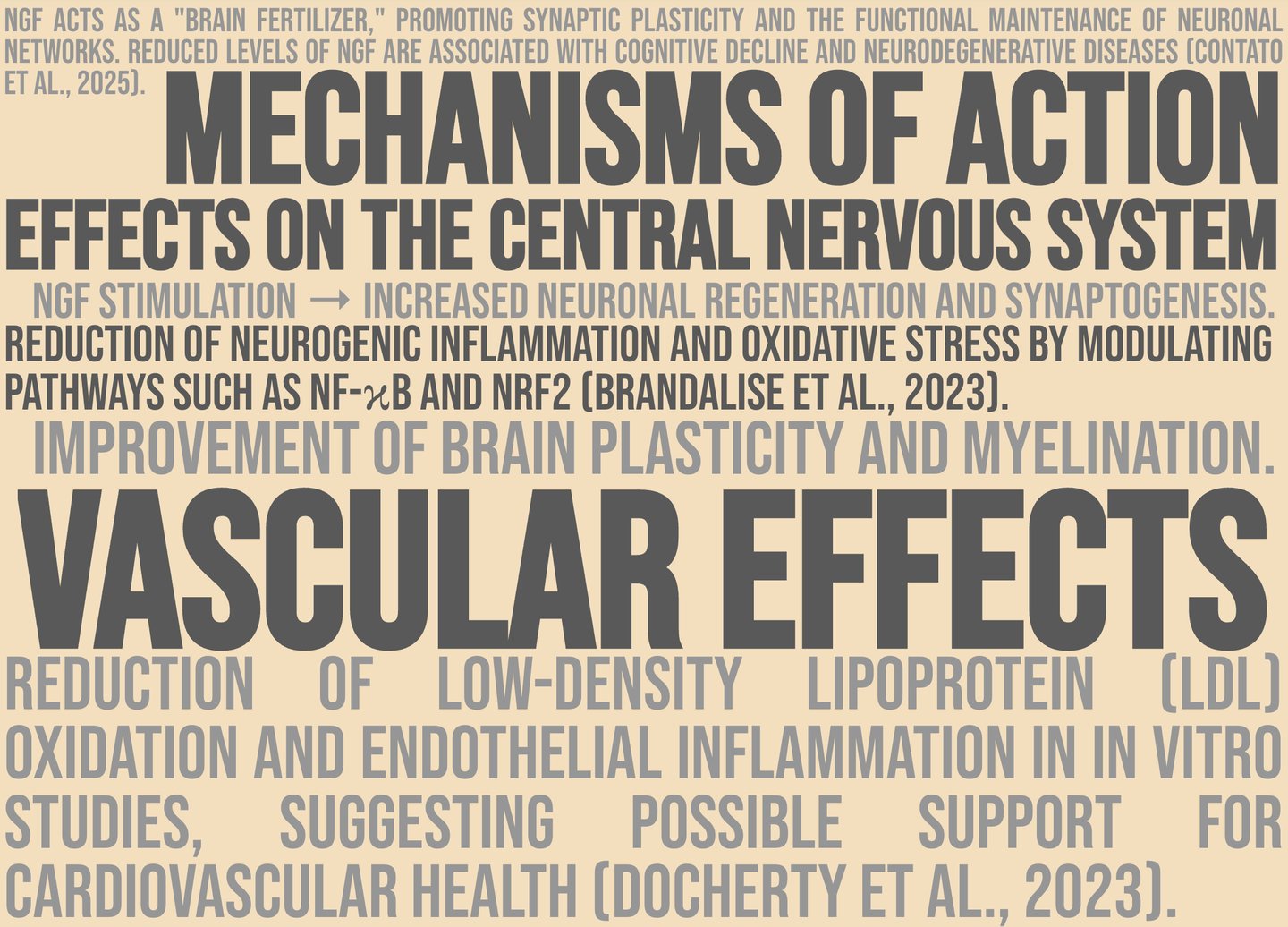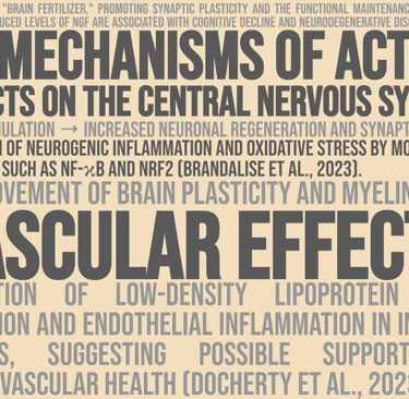 Conditions it may help with: Mild cognitive impairment, prevention of Alzheimer's and Parkinson's disease (preclinical potential), recovery from nerve injuries, and support for depression and anxiety.
