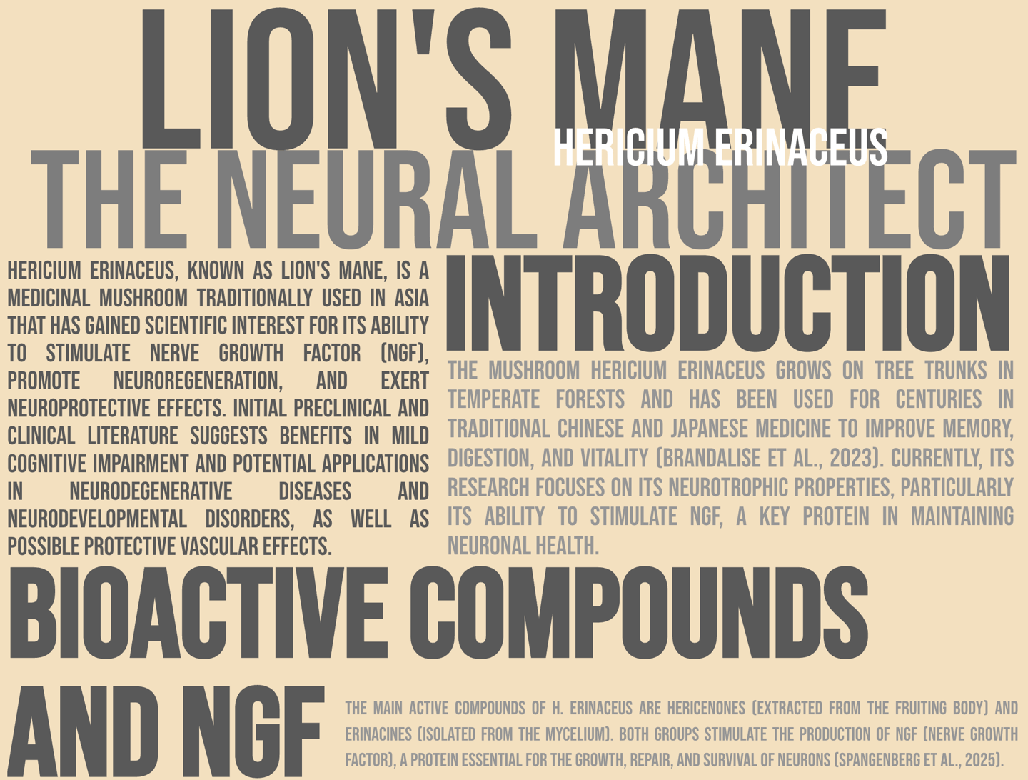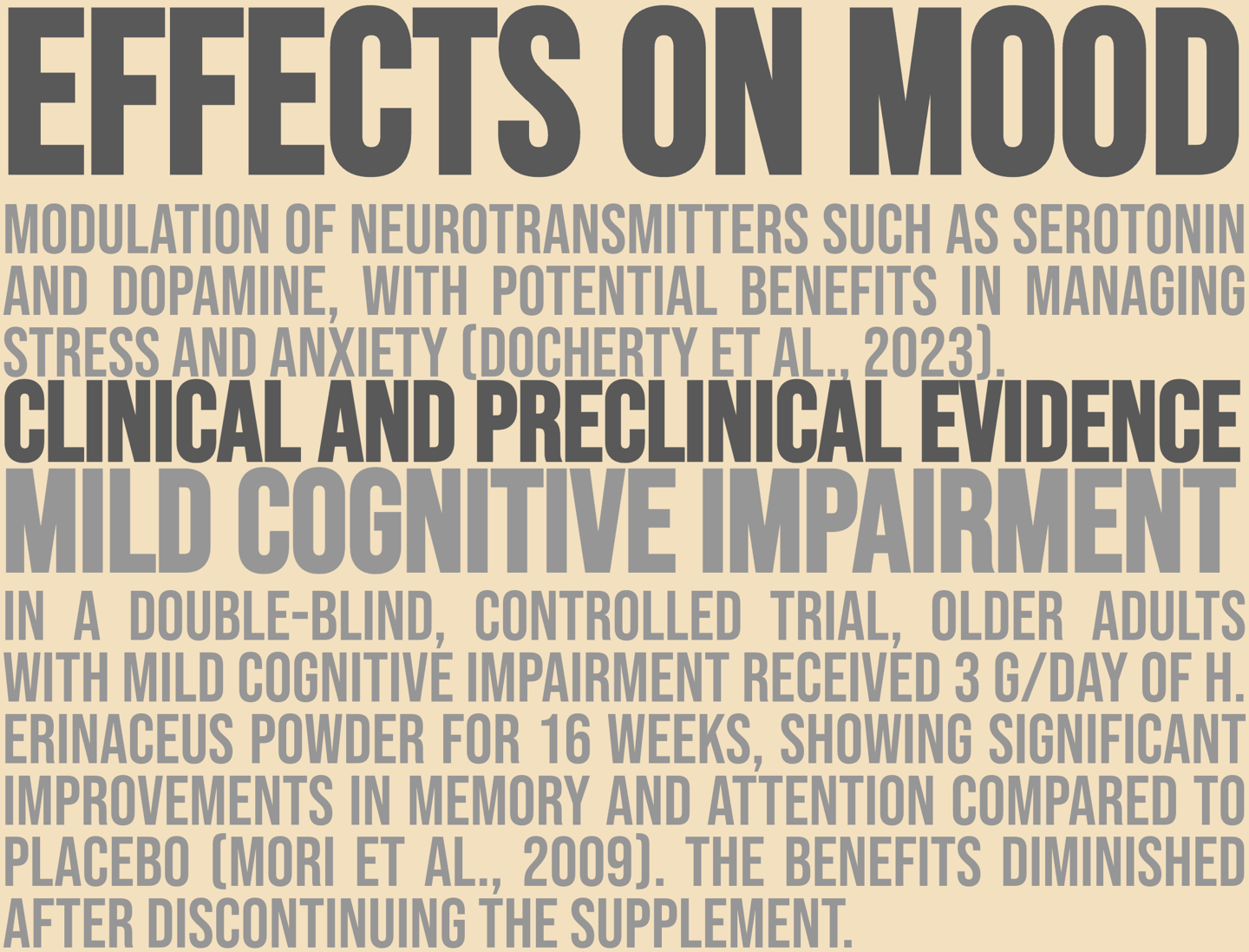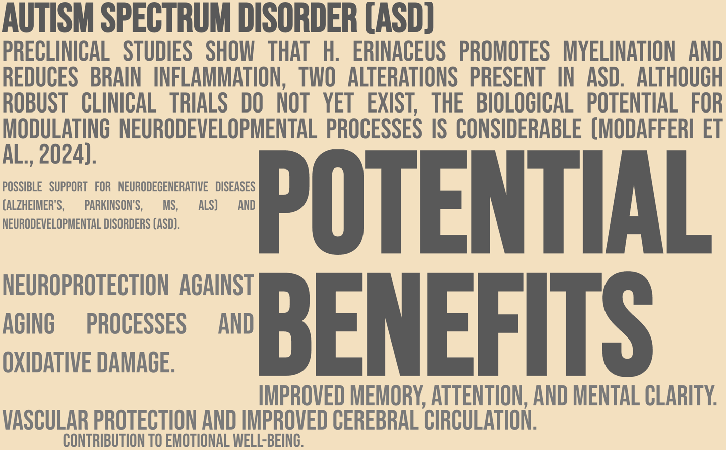 Mechanism of action: Stimulates the synthesis of nerve growth factor (NGF), promoting neuron formation and repair and improving synaptic plasticity. It contains hericenones and erinacines with neuroprotective activity.
