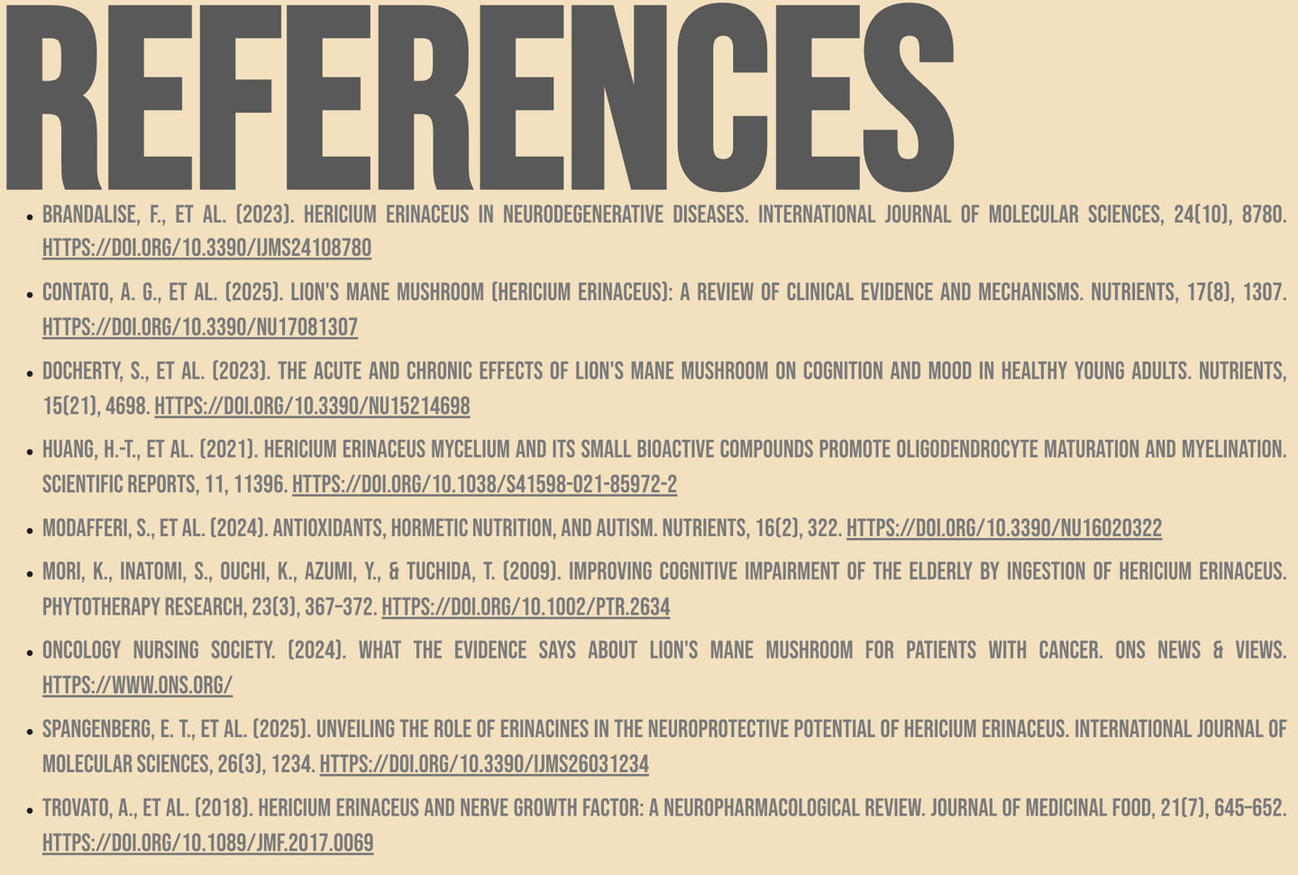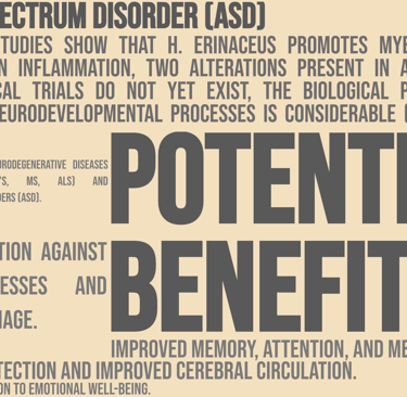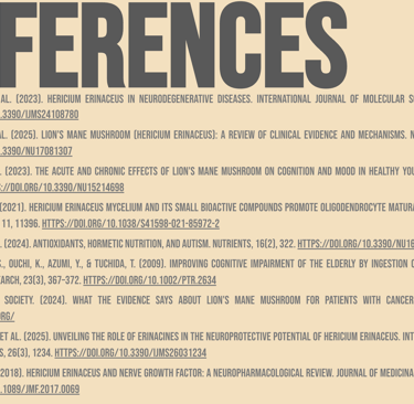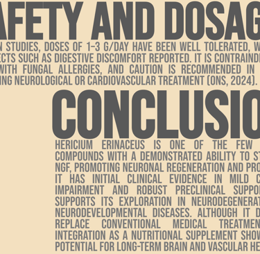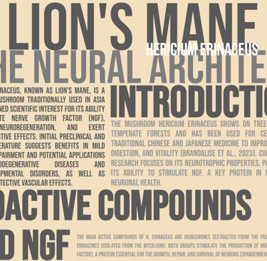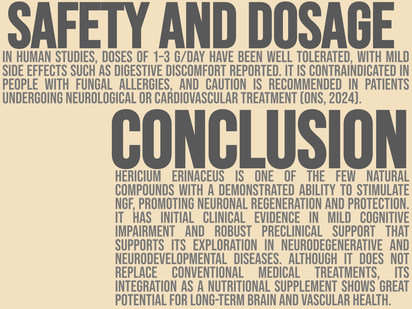 Mechanism of action: Stimulates the synthesis of nerve growth factor (NGF), promoting neuron formation and repair and improving synaptic plasticity. It contains hericenones and erinacines with neuroprotective activity.