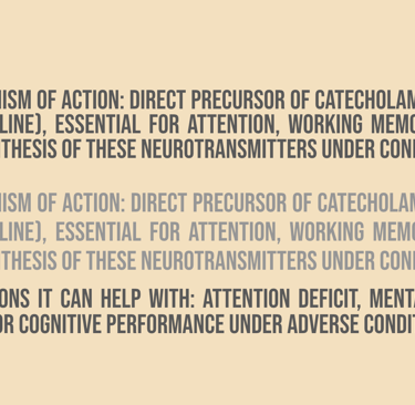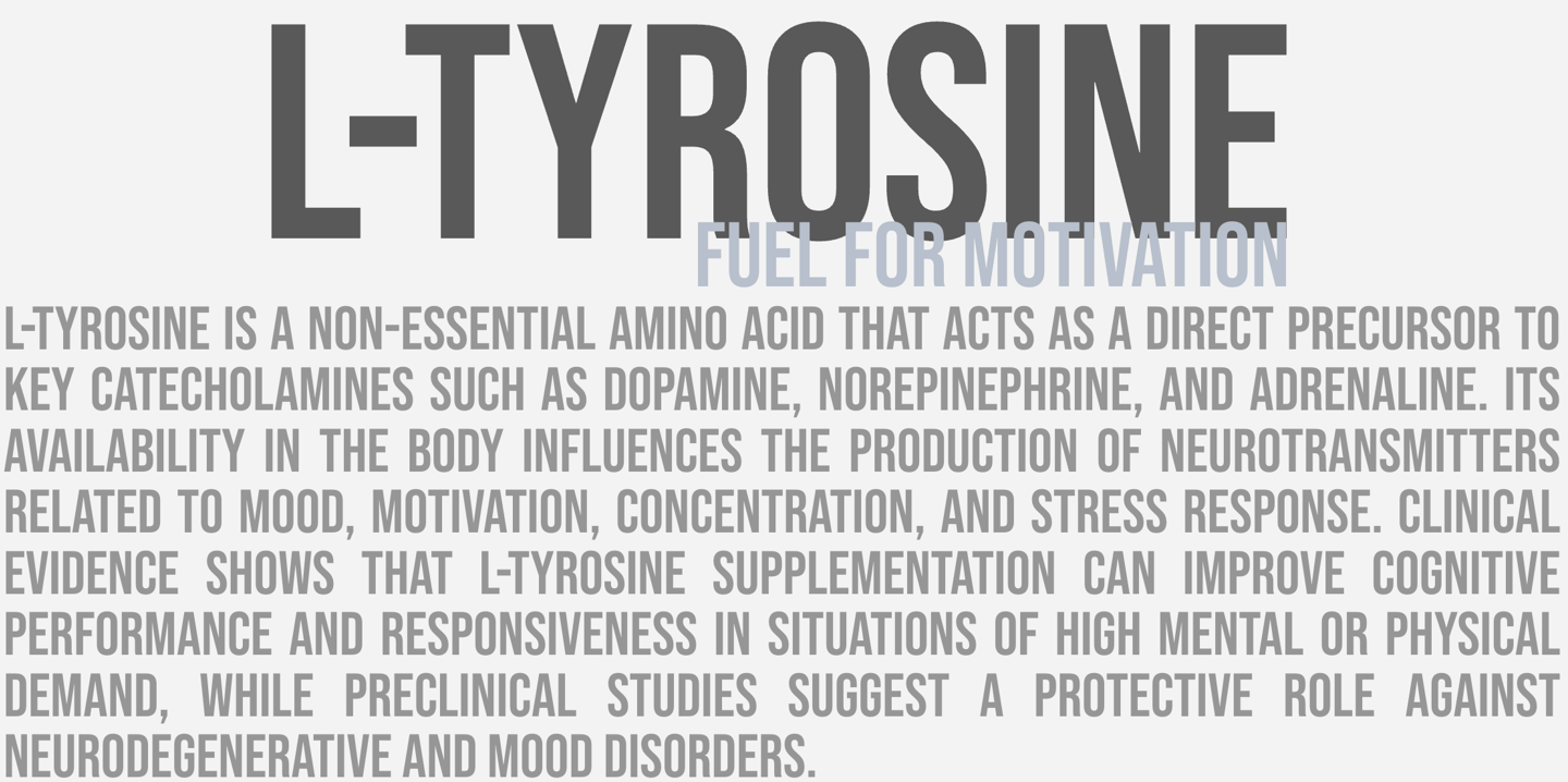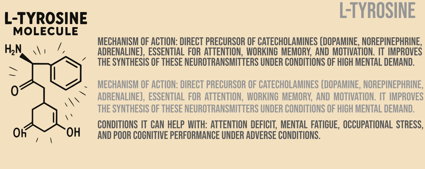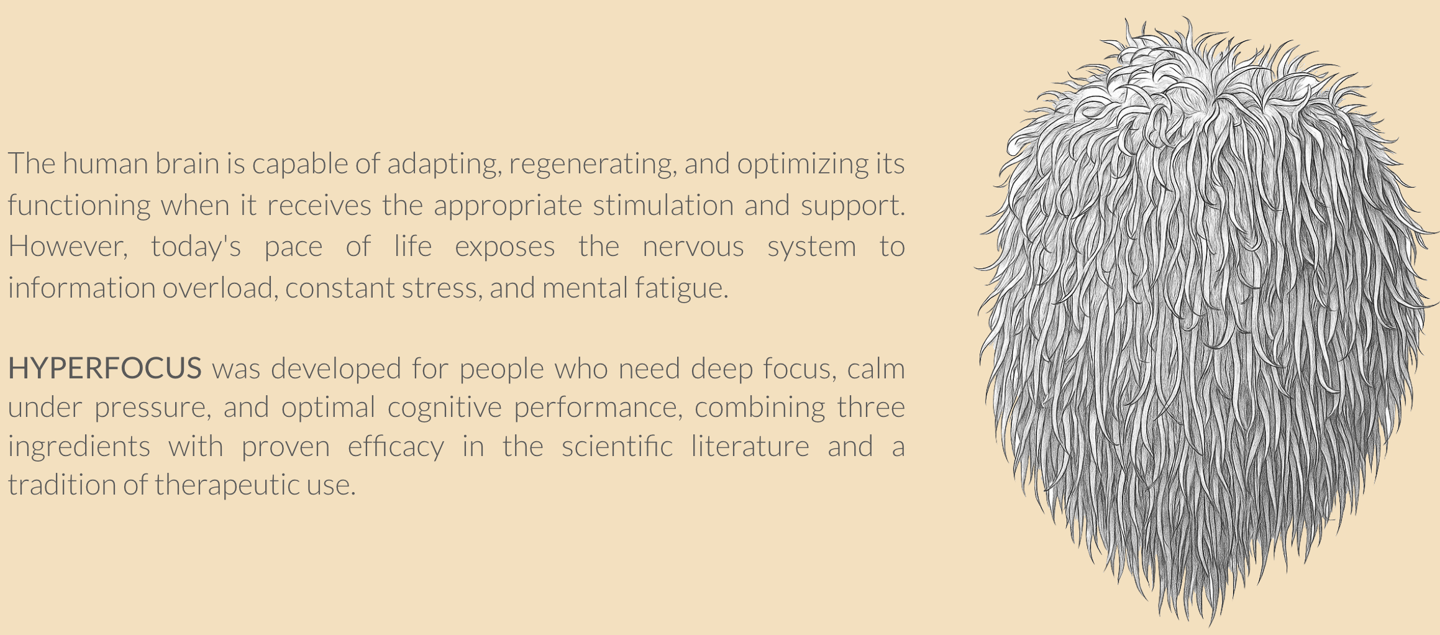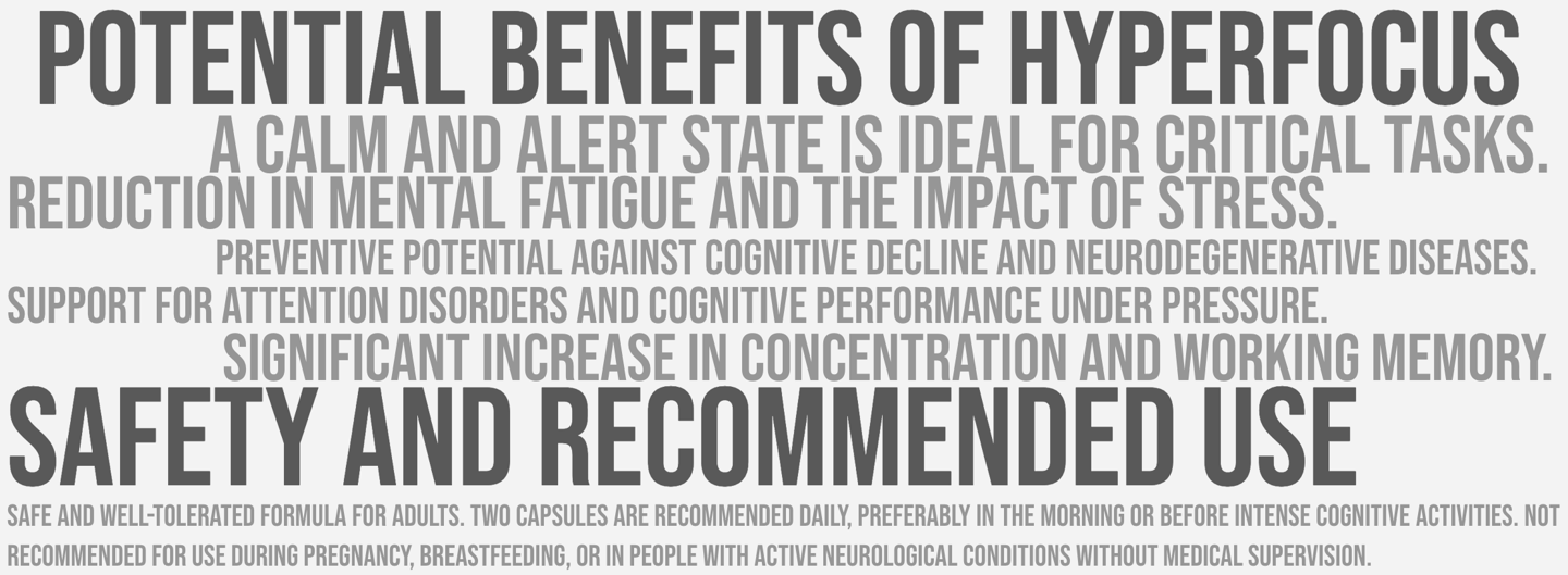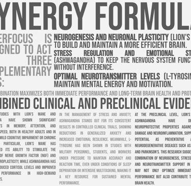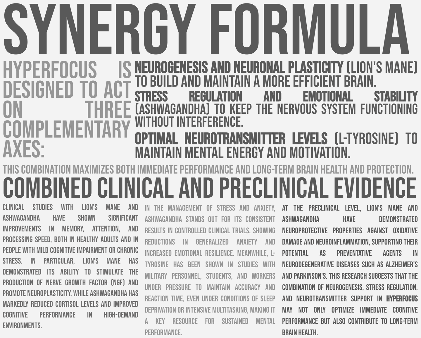 HYPERFOCUS is an advanced formula that combines Lion's Mane (Hericium erinaceus), Ashwagandha (Withania somnifera), and L-Tyrosine to optimize cognitive function, modulate stress, and protect brain health. This natural nootropic targets neurogenesis, neurotransmitter production, and stress axis regulation, providing sustained mental clarity and improved tolerance to highly demanding environments.